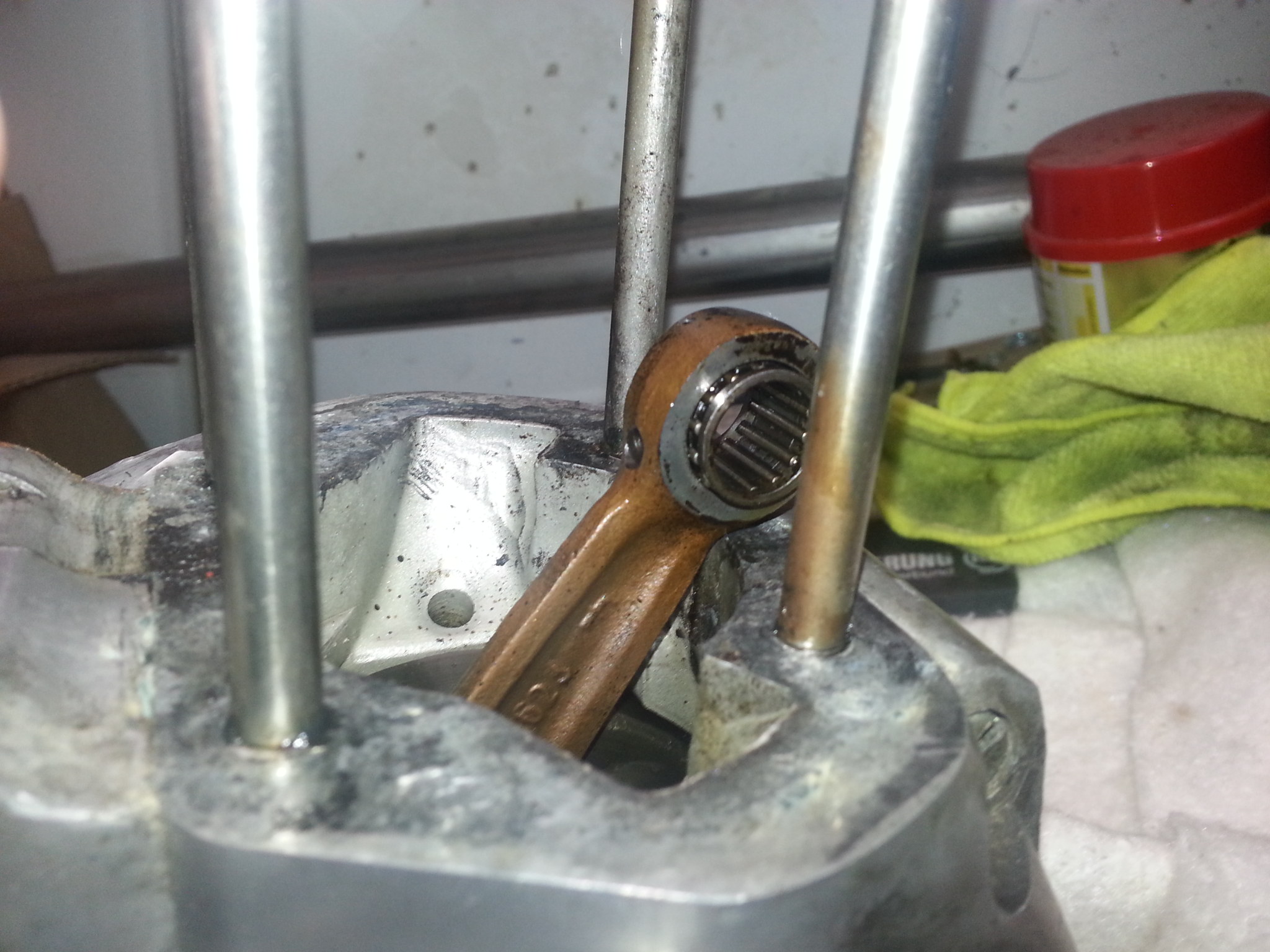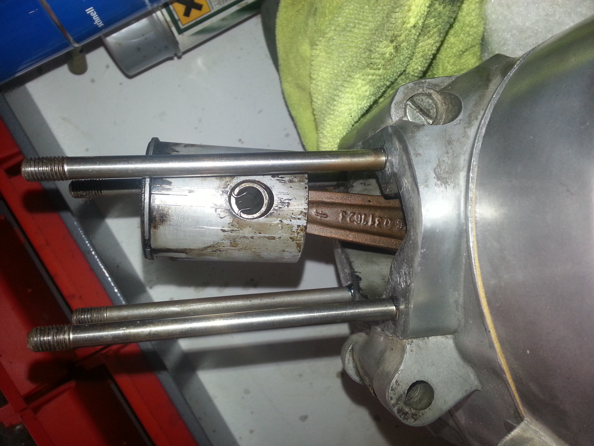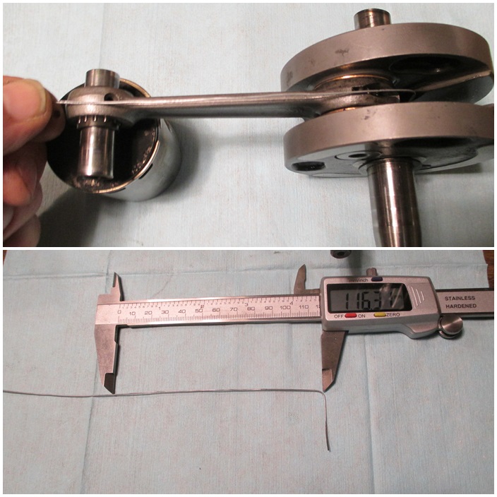 Hallo Stefan,Namensfetter.....ich hab mir da mal ein paar Gedanken gemacht... Also 1. hast du wie der Martin das schon richtig mit seinem Fachwissen erläutert hat, wirklich eine Vollwange verbaut. Ich habe gottseidank zur Zeit eine ausgebaute Vollwange mit 91ger Pleuel auf dem Tisch liegen.(Warte auf eine Neue), hier konnte ich die Pleuellänge von 91mm nachmessen ,Auge mitte bis Auge Mitte(siehe Fotos), wie aber messen im eingebauten Zustand??? sehr gute Frage..da kann man sich nur mit einem Trick behelfen( wenn auch das etwas schwierig ist wegen der Tolleranzen)--auf jeden Fall kannst du dir einen stabilen Draht biegen am Ende einen Winkel. Damit hakst du unter das Auge des eingebauten Pleuels und kannst die Länge so ermitteln. Die beigefügten Fotos sind selbst erklärend. Die GESAMTLÄGE meines Pleuels(91) liegt bei 117 mm, du solltest bei deinem Kurzpleuel(85) also gute 6 mm weniger GESAMTLÄNGE messen, selbst wenn du Tolleranzen berücksichtigst, solltest du erkennen können, ob DEIN Pleuel kürzer zu meinem ist -oder gleich lang. Vielleicht kann Martin dazu noch was sagen--aber diese Hilfestellung kann ich dir (mit meinem Sachverstand) anbieten. Gruß Stefan