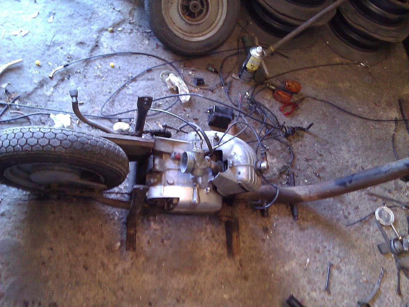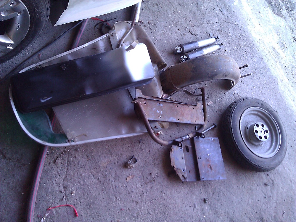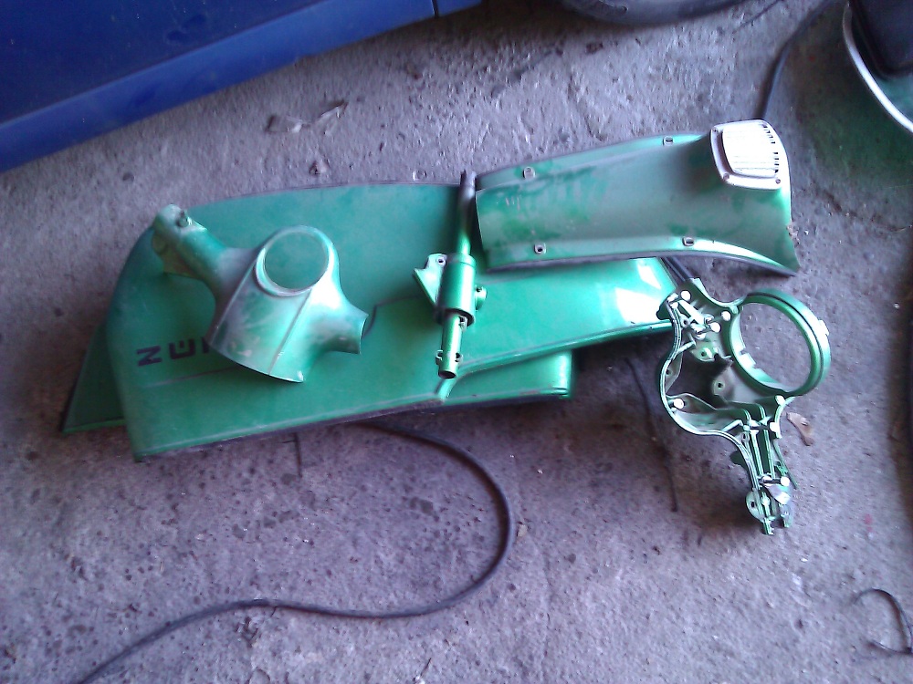 So, heute war es endlich soweit; Zeit zum schrauben! Bei manchen sachen hab ich ja echt geflucht und mich oft gefragt warum man das SO baut.. Letztendlich bin ich aber doch recht weit gekommen würde ich meinen. Fotos sind nicht wirklich toll, so im Eifer des Gefechts entstanden. Mit dem Knieschild hatte ich ganzschön zu kämpfen bzw eher mit der Pedalerie, da hättens sich echt was besseres einfallen lassen können. Beim Kettenschutz bin ich hängen geblieben, irgendwie will der nicht ab, die 2 Schrauben am Rahmen habe ich gelöst hinten die Verbindungsschraube auch aber irgendwo hängts noch Interressant wäre auch noch wie ich diese Kugelköpfe von den Gestängen aushängen kann. Und der Endstand für heute, nicht mehr viel über ;) Blöderweise ist mir die Befestigungsschraube vom Frontscheinwerfer abgerissen, da muss ich mal schauen wie ich die noch rausbekomme. Bremsbacken vorne sahen eigentlich noch gut aus soweit ich dass beurteilen konnte, aber da die nicht die Welt kosten mache ich sie lieber auch mal neu. Der Gleitstein sah echt nicht mehr besonders toll aus, verbogen und sogar gerissen Der Auspuff war schon mit dem Krümmer verschweisst, dieser ist mir beim Ausbau dann auch zerbröselt, muss mal schauen ob es reicht wenn ich nur den Krümmer neu mache. Also denn ergänze ich mal meine Einkaufsliste: Bremsbacken vorne und hinten Krümmer (32/26mm Anschluss?) Bremszug Kupplungszug Gaszug Bremspedalgummi Fußschalthebelgummi Kickstartergummi Gleitstein vom Gasgriff Hella Lenkerendenblinker Gummimatten Kantenschutz Schraubensatz Weisswandreifen mit Schlauch Ob ich dann die Radlager wirklich neu brauche? Oder die Kette? Irgendwelche Teile von der Dämpfung vorne? Wegen der Umrüstung auf 12V muss ich mir auch noch gedanken machen, da sollte ich mir meine Ulo Box vielleicht erstmal genauer anschauen.