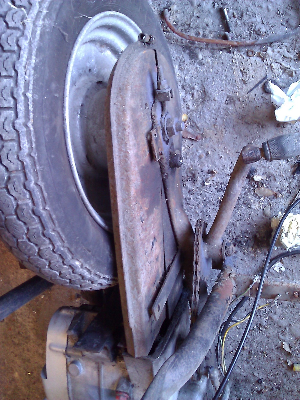 Hab mich heute mal an die Hinterachse gemacht, war garkein Problem, ging gut raus. Danach hab Kettenschutz und Trittbretter gerichtet, diese Teile und den Hauptständer mit der Zopfbürste so gut es ging von Lack und Rost befreit und eben noch im Zitronensäurebad versenkt. Mal schauen wie dass in ein paar Tagen aussieht.