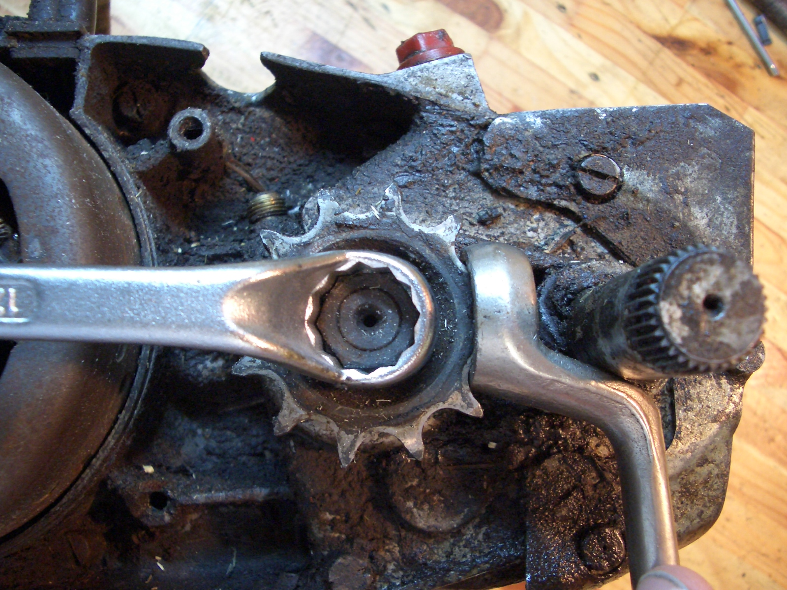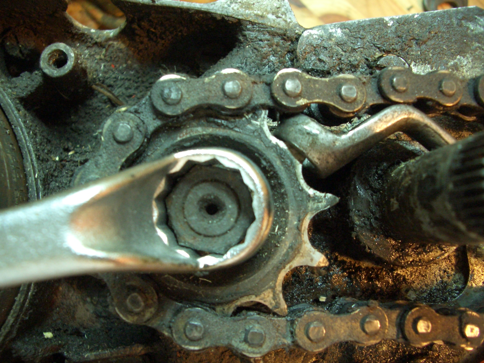 Oder........ 2. bei eingebauter Kette kann man auch einen verkröpften Ringschlüssel SW 10 ins Ritzel einhaken und in Fahrtrichtung das Ritzel blockieren lassen. Auch bei dieser Aktion erleichtert eine zweite Person das ganze enorm. Martl
