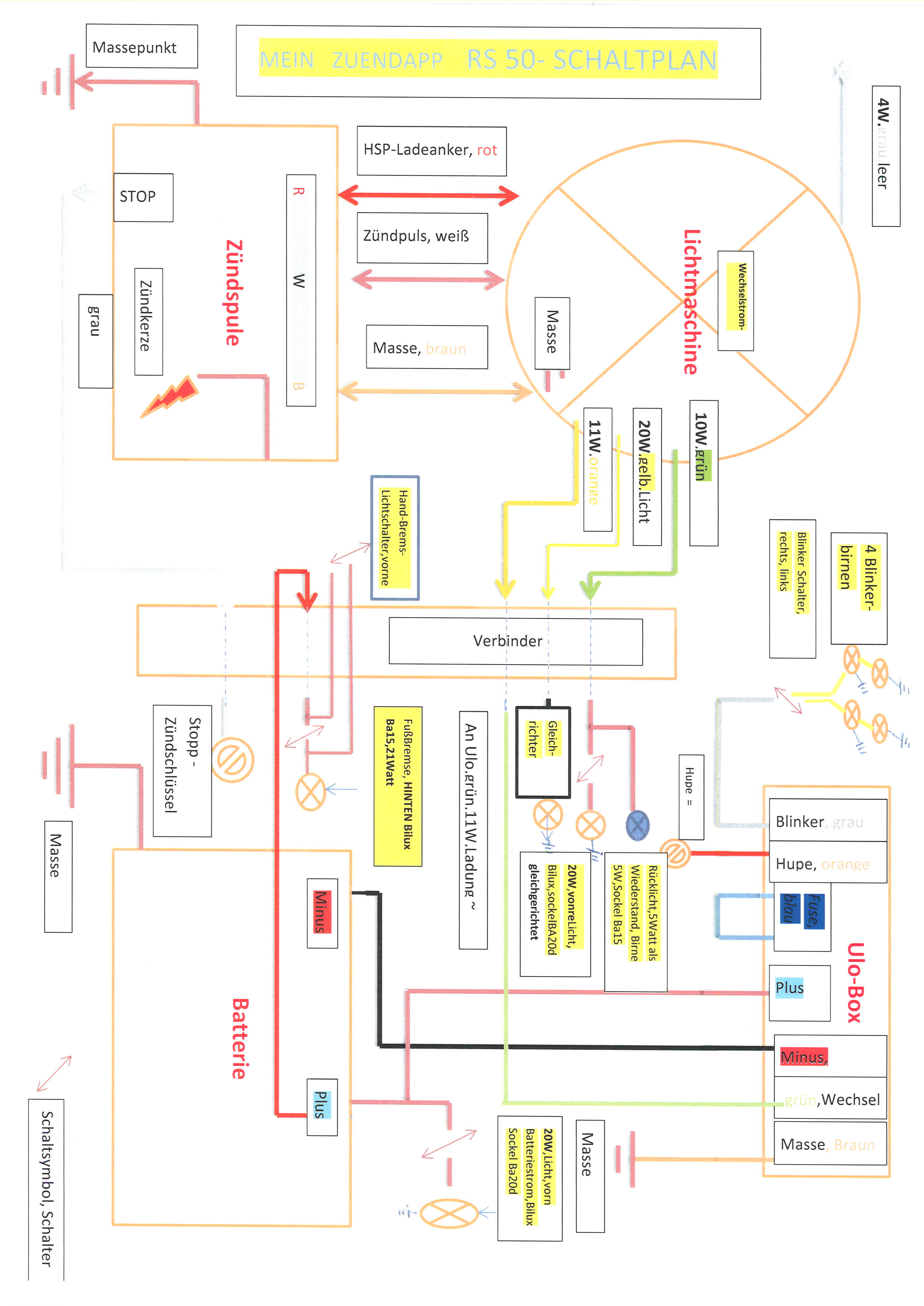 Hallo Forum, unsere Roller sind mit den mikrigen 6 Volt Agregaten und ungenügender Watt/ Leistung ja nicht die "hellsten"!!- Ja, es gab schon div. Beitträge im Forum- Aber ich hab mir auch mal Gedanken gemacht: Hab bei meiner RS 50 einen Sternanker verbaut, der liefert 6 Volt und 4 Watt, 10 Watt,20Watt,und 11Watt. Die 20 Watt Wechselstrom hab ich gleichgerichtet, bringt, da es Gleichstrom ist, ein stärkeres Licht am Fronscheinwerfer!! ( Infos: Licht bei Gleichstrom/Wechselstrom auch im Internet) Den Rest der verschiedenen Spulen Wechselstrom greife ich für ULO-Box,Bremslicht und Rücklicht ab, die UloBox speist meine Batterie, von der ziehe ich zusätzlich für Frontlicht einen Teil für meine Biluxbirne und Hupe-mehr folgt, Gruß Stefan greyrs50 - wenn mal in HH die Sonne scheint-sofort losrollern-selbst wenn es nachts ist!!
