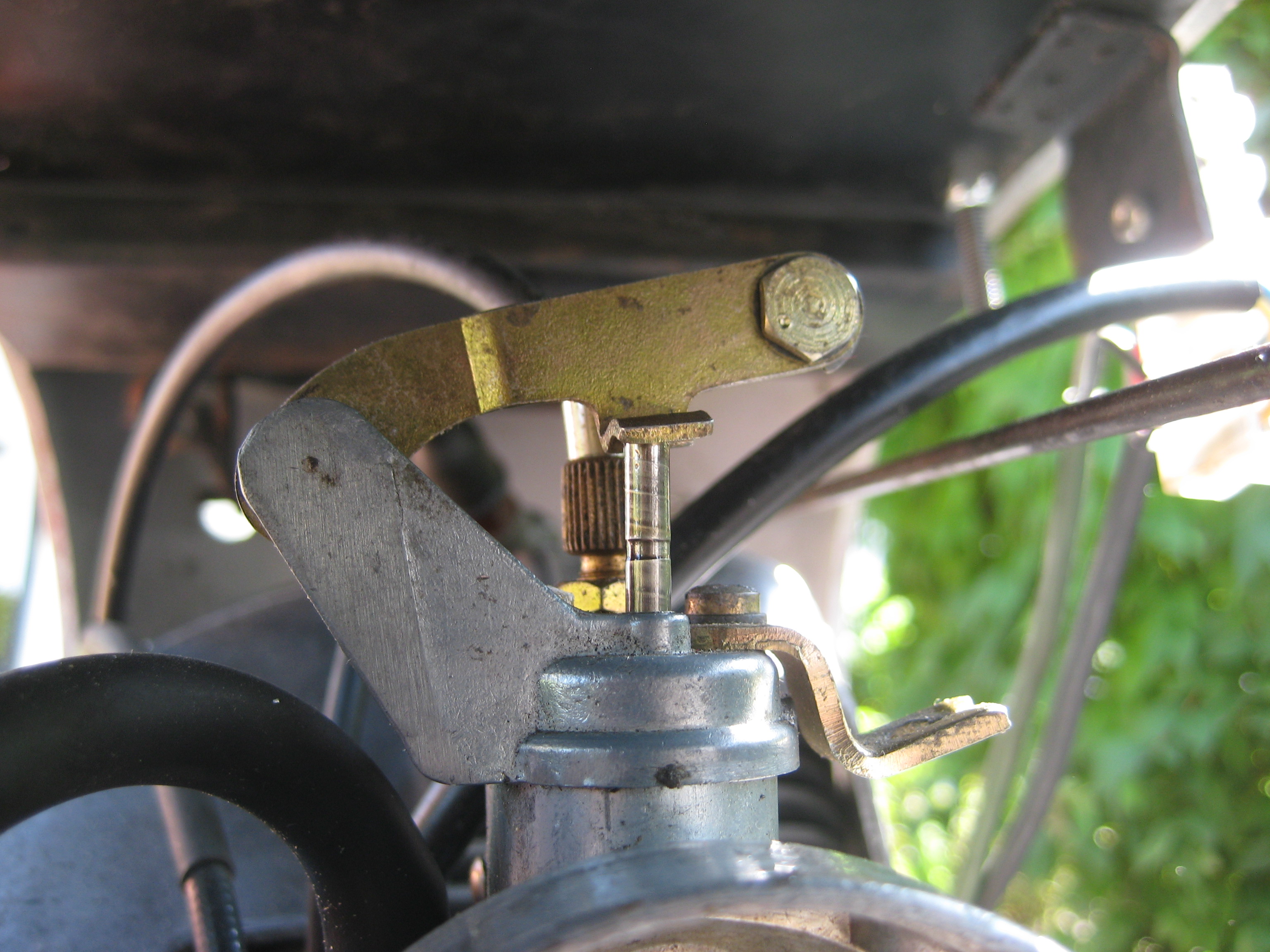 Oben am Hebel, in der Schraube ist ein Loch, da muss er durch. An der Gabel wird er eingehaengt. Wenn Du vorne am Hebel ziehst, schiebt sich das Plaettchen vor den Ansaug. Und wenn Du Gas gibst, zieht es der Schieber wieder nach oben und er kann ungehindert Luft ansaugen. Mittels einer Feder wird das ganze noch auseinander gedrueckt.