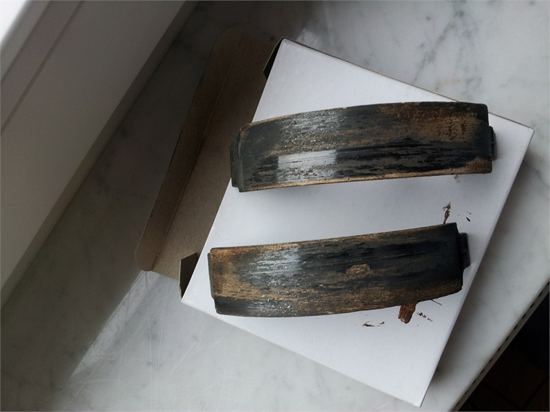 Hallo, schaut Euch mal diese Beläge an, richtig verglaste Oberfläche, kein Wunder, dass die nicht gegriffen haben-hab jetzt neue aus Helmuts Shop-alles ist ok. aber warum verglasen die alten so???, ich denke zu alt, zu hart und zu heiß gelaufen ?? Gruß Stefan