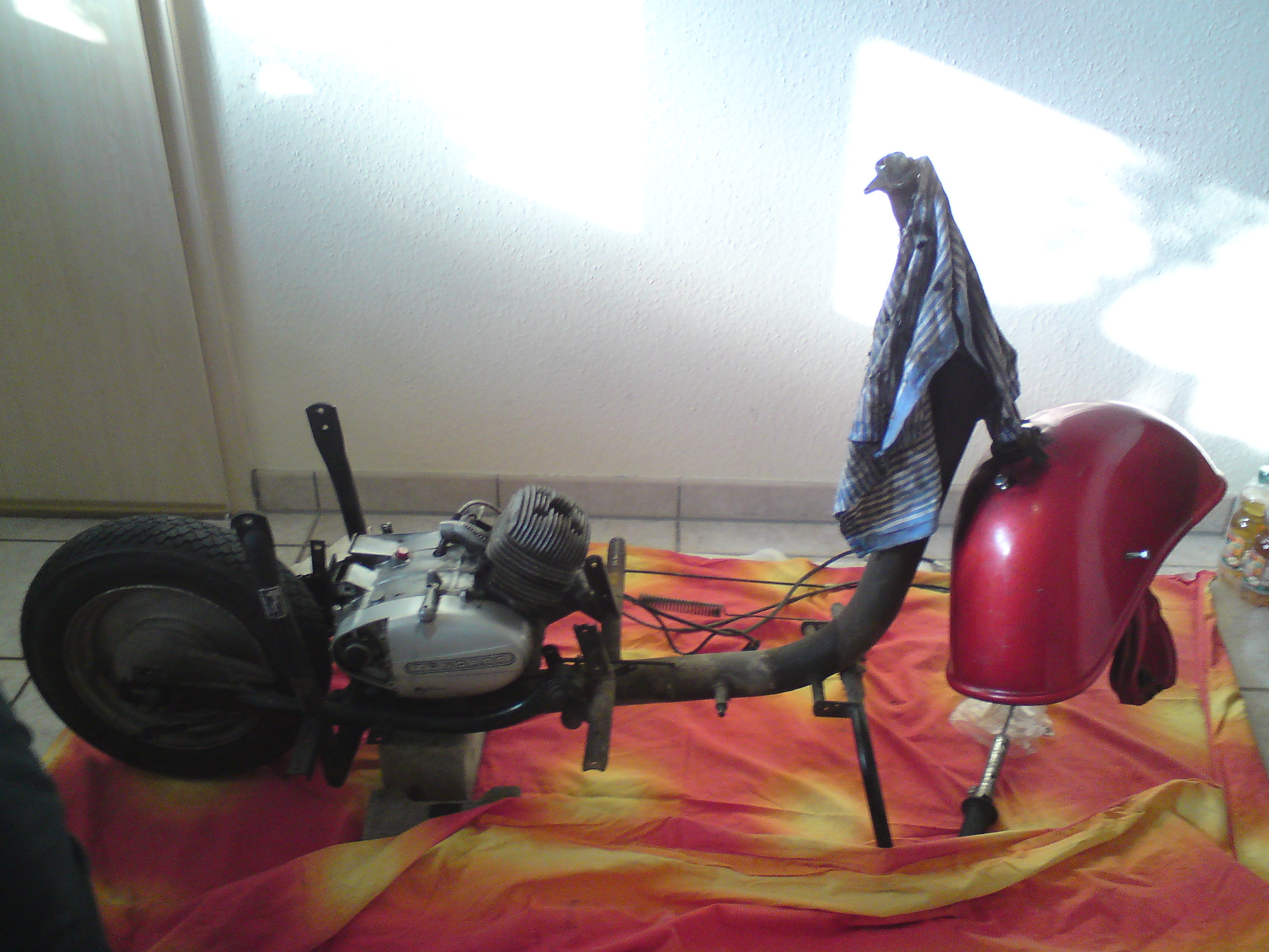 Hallo Leute... ich hab mir vorgenommen meinen Diego (so heißt der kleine) näher kennen zu lernen. Zu den Zwecken wollt ich ihn auseinander nehmen. Den Motor mal überholen..oder was man da so macht...Rahmen sandstrahlen lassen und am liebsten natürlich auch eine neue Lackierung verpassen lassen. Naja..falls das Geld reicht. Auf jeden Fall krieg ich die doofe Vordergabel nicht ab. Ich hab fast alles ab...aber für diese riesige Mutter scheine ich zu wenig Kraft zu haben. Ich hab Caramba drauf gemacht ...tagelang...es zärtlich und auch heftiger mit nem Hammer versucht. Was mach ich denn nu? Man muss doch unten das Blech festhalten und oben die Mutter lösen oder? Wie rum denn überhaupt? Links rum oder? Hier der bisherige Stand: