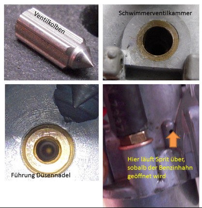 Also, mein Bericht. 1. Hauptdüse ist eine 60er. 2. Wenn ich den Gasgriff ganz aufgedreht halte, stirbt der Motor mit stottern ab. Hab daraufhin den Vergaser ausgebaut und zerlegt. Schwimmer habe ich nun auch abgebaut und den Ventilkolben gereinigt. Meiner Ansicht nach alles soweit i..o. und Test wie zuvor beschrieben durchgeführt. Ergebnis - das Ventil öffnet nun schlagartig und ohne die zuvor festgestellte Verzögerung! D.h. offenbar waren ggf. verunreinigte Rillen des Ventilkolbens der Grund für eine verlangsamte Öffnung des Ventils. Ohne Sprit hat man nun das Klickern des Ventilkolbens sogar hören können. Gesagt getan, alles wieder eingebaut und Benzinhahn auf. Soweit alles ok, nur das nun der Sprit aus dem Vergaser lief. Habe im Bild mal markiert wo es herausläuft. Vor dem Zusammenbau war ich versucht die Betätigung am Schwimmer etwas zu verbiegen um ggf. etwas früher das Ventil zu schließen. Nach Beurteilung der Befestigung im Schwimmer habe ich das dann aber besser gelassen.