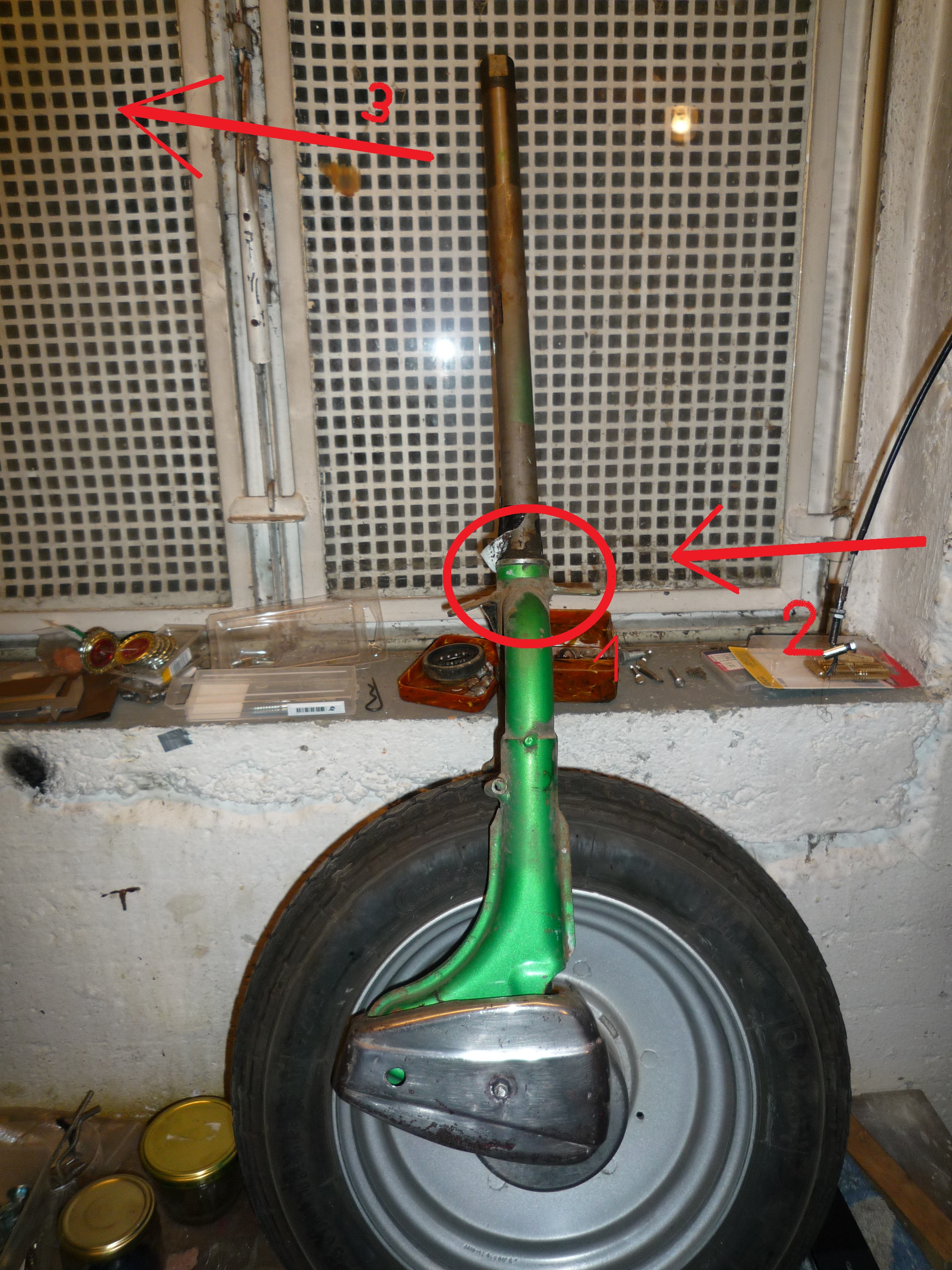 So, bin heute mal dazu gekommen die Gabel auszubauen. Ich bin eigentlich soweit ganz zufrieden, hab mal n Winkel hingehoben und sie ist kerzengerade. Die Lager sahen auch ganz ok aus. Nur hatte ich das gefühl das das Rohr direkt an der Gabel ein klein wenig abgewinkelt ist, nach hinten, Bilde ich mir das ein? oder gehört das so? die 1 im Bild Zeigt den Fixpunkt an ab dem ich die Abwinkelung vermute, die 2 im Bild zeigt darauf und die 3 im Bild zeigt die Richtung in welche sich das rohr zu biegen scheint. was sagt ihr? liebe Grüße, Josua